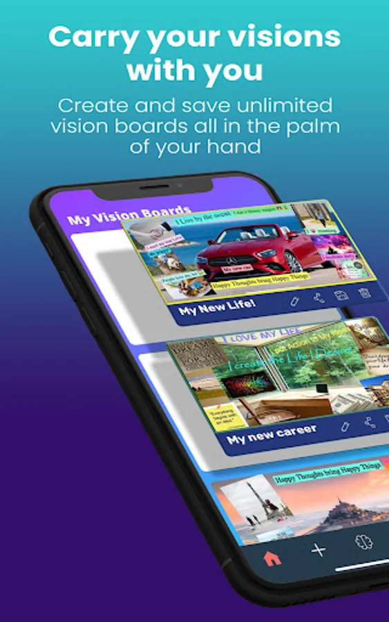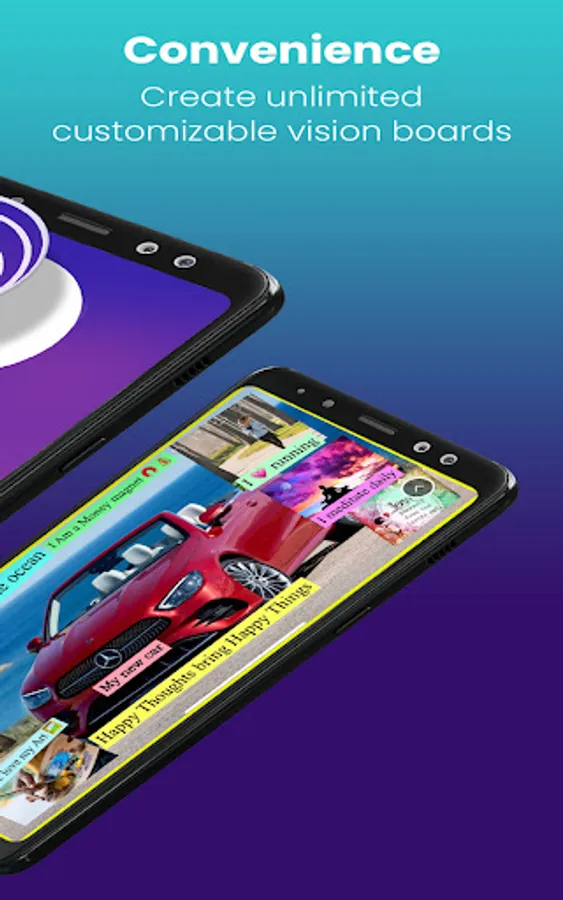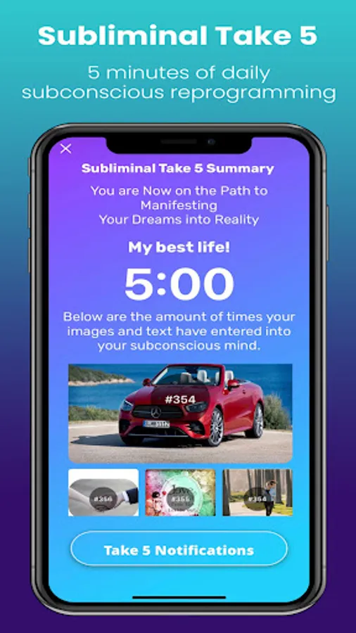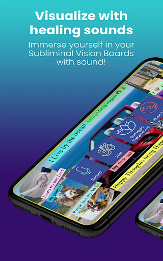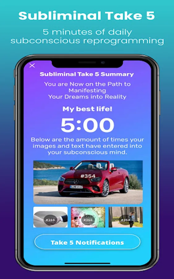 Just look at your created vision board using our unique Subliminal Take 5 feature 5 minutes right before you go to sleep and 5 minutes after you wake up. As you look at your board, put on your headphones to immerse yourself in your vision and allow each image and affirmation to flash subliminally at the speed that retrains your subconscious.