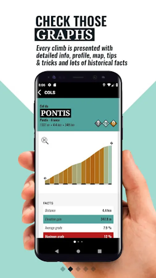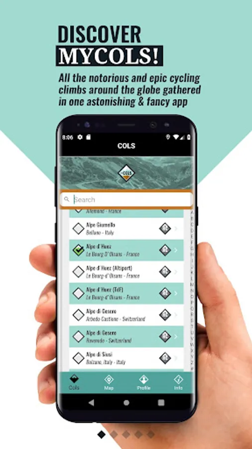 You can search through a list of 8000 famous and less famous climbs in our app. All climbs are provided with a detailed profile, length, height difference, average gradient, region, country, starting point and end point on a map.