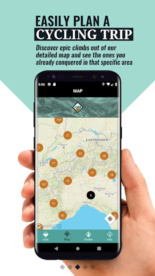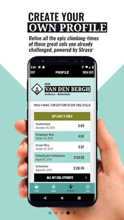 What makes cycling in the hills of mountains so special? The challenge, the view, the scenery or cycling together with friends? Everyone has their own memories and highlights while biking through the famous hills, or even more over those epic high mountains. Our app helps you achieve your cycling dreams of conquering those iconic mountains from the world of professional cycling. You will never forget that climb because it is now in your myCols profile.  A personal profile with all your climbs, times, challenges, jerseys and stories. Moreover, you will find all the details and the app even calculates all your climbing times.