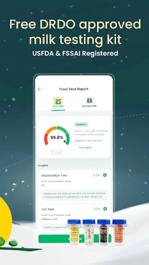 We have 3-level quality testing - at farm, at plant, and at your home. While our milk testing kit lets you check any milk's adulteration at home, we ensure premium quality by conducting a real-time analysis of our Milk across 72+ quality parameters every day. This includes testing for 100+ adulterants, including pesticides, antibiotic residue, mercury, lead, naturally occurring toxic materials like aflatoxin, and common mixing agents like detergent, urea, borax, and cane sugar.