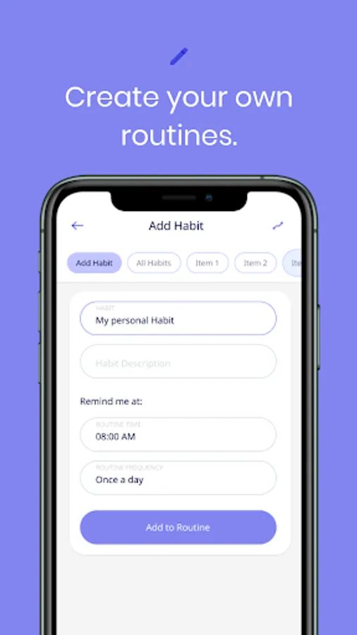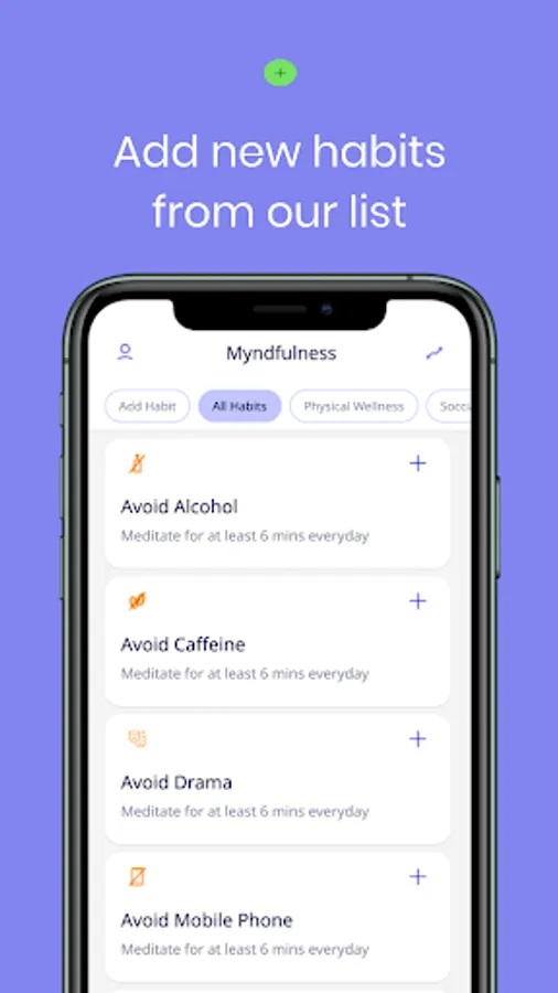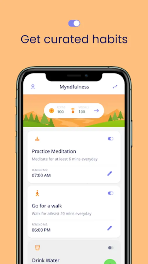 Myndfulness helps users to build better habits that promote self care. Your habits play a major role in your mental wellbeing, so we make it easier to stay accountable to building healthy habits and routines through our unique habit reminder system. You can choose from our ever-growing library of self-care habits and create custom habits to match your life goals.