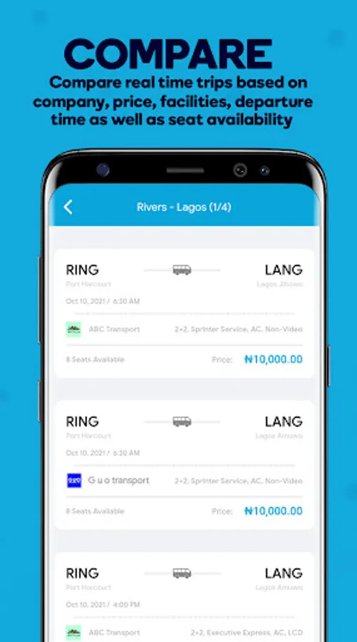 2. Compare real time trips based on their company, price, facilities, departure time as well as seat availability