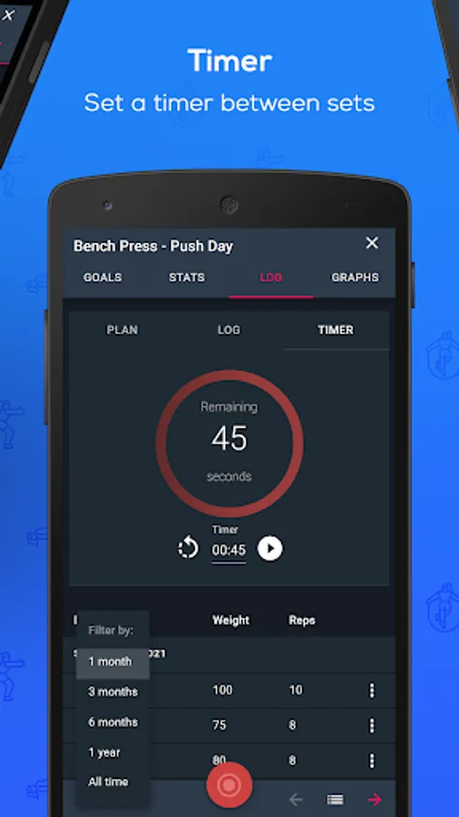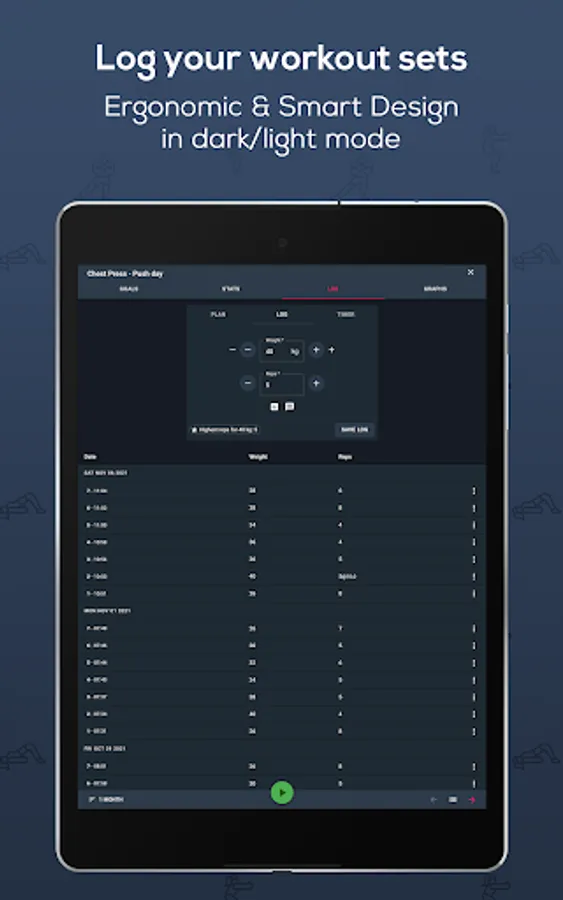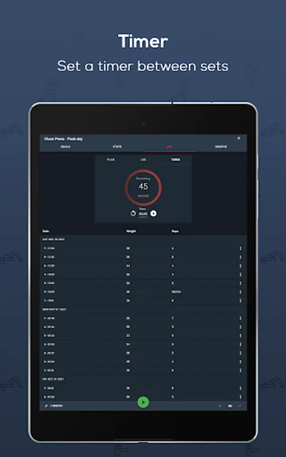- Supports all exercise-types: weight & time, weight, time, distance & time, etc.