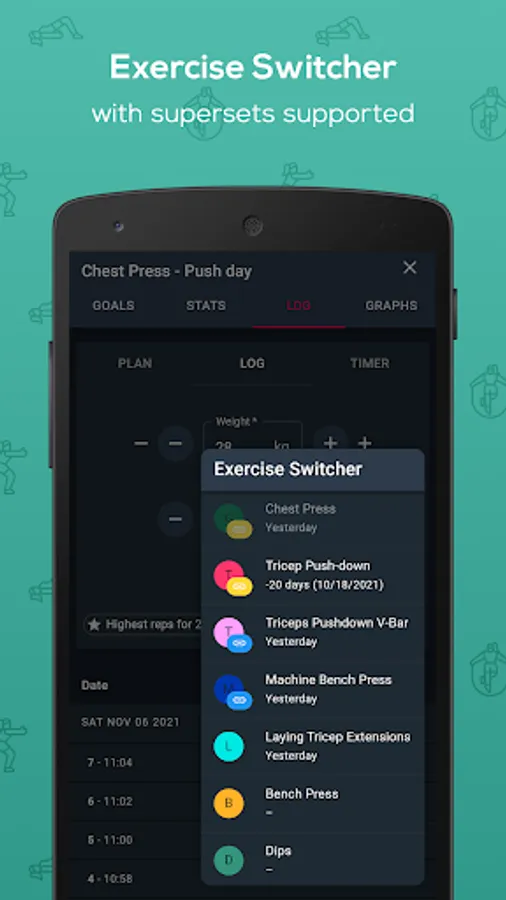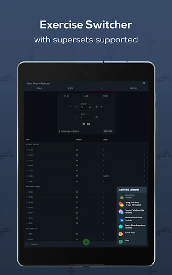 - Create workout plans (plan workout sets ahead & add supersets).
