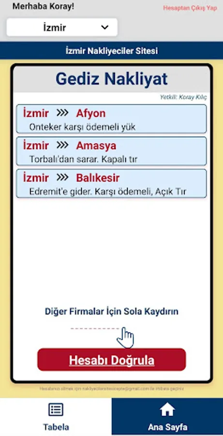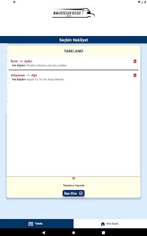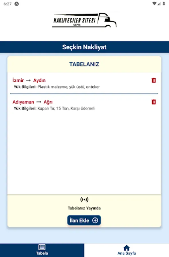 Nakliyecinin, yük ilanlarını paylaştığı tabelalarını sanal ortama aktararak taşıyıcılara sunmasını sağlayan uygulamadır. Diğer birçok uygulamadan farklı olarak Nakliyeci, yük ilanlarını tabelasında paylaştığı gibi , Nakliyeciler Sitesi Cepte uygulamasında da aynı şekilde tabela oluşturarak taşıyıcılara sunacak. Taşıyıcılar da kendileri için uygun yükleri pratik bir şekilde bulabilecek!
