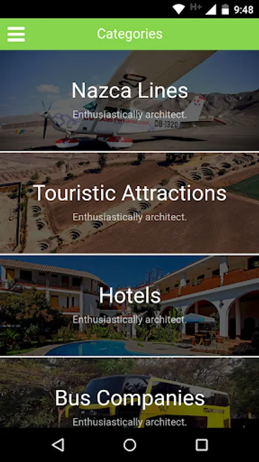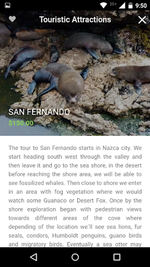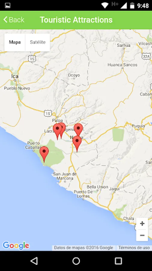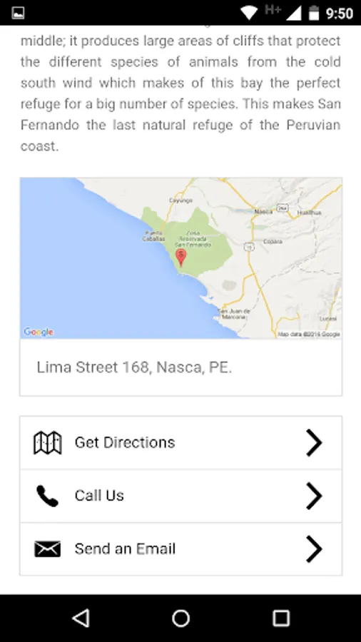 this app is going to help you to get to the dfferent archeological sites, hotels, restaurants, bus stations in Nasca Peru and is going to give you the information of these places and lead you on with the geolocation to get to these places getting more amazing your visit to the Nazca Lines
