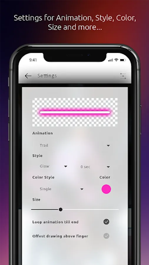 Neon effect on photo gives you the option to customize your art brush. Play around with different sizes and styles. Neon effect on photo also has the cool feature of adding glow animation to achieve that awesome neon sign or lightning effect.