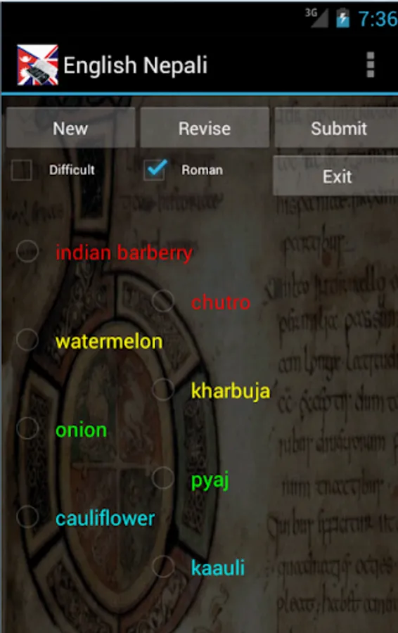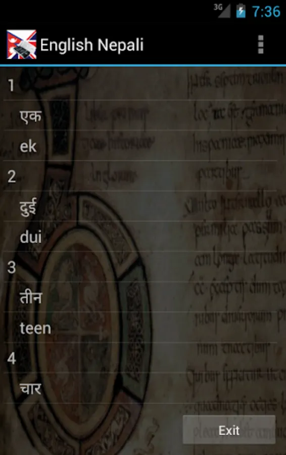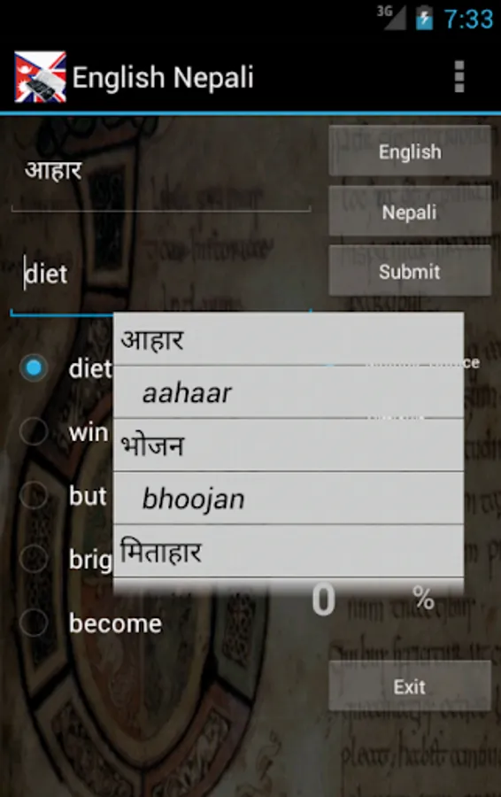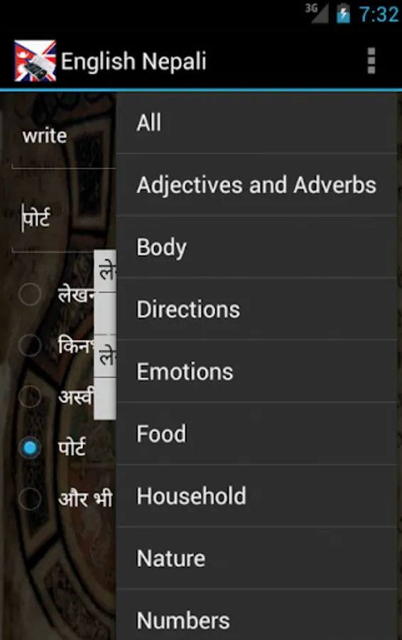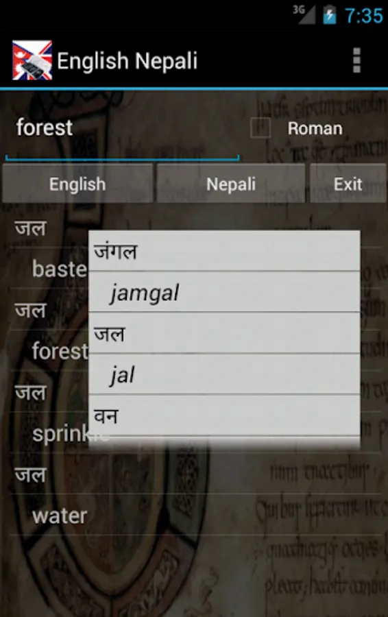 Nepali English Dictionary (with transliterations) - travel dictionary to translate Nepali to English displaying a list of words in English. The dictionary also translates from English to Nepali. Copying a word from the translated list for a reverse translation can be used to find synonyms and to understand the broader use of the English word in the Nepali language. Although the Nepali English dictionary does not provide definitions or examples, the use of the translation software in this way provides you with a mechanism to better understand English words in the Nepali context without the need for definitions. 30K references.
