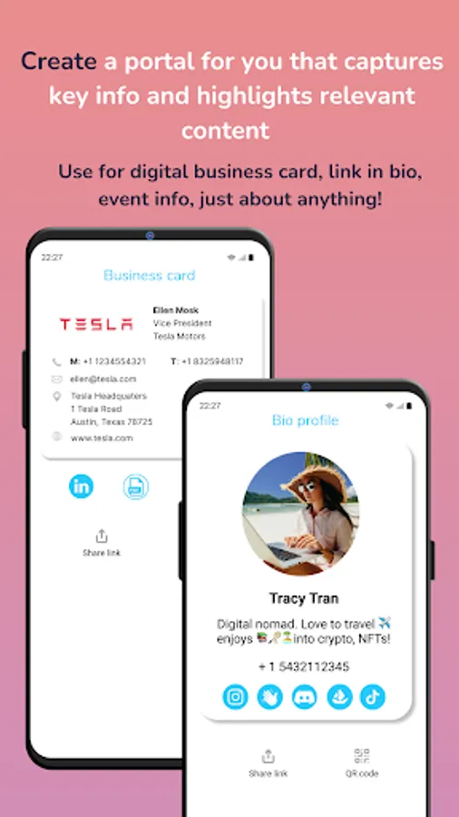 • Add links to your website, podcast, blog, music, e-book, NFT artwork, product portfolio and more. You can also use links to integrate tools for appointment booking, survey forms, customer feedback, map location, and much more – the applications are limited only by your imagination!