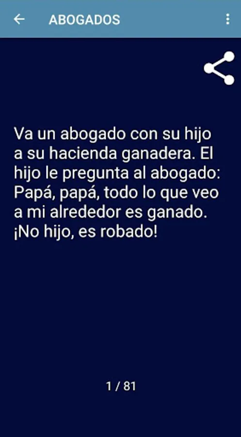 With this application you do not need INTERNET to be able to visualize more than 3000 jokes and it has more than 50 of the best categories of jokes that exist in the network (example jokes of lawyer, pepito, animals, drunkards, etc).