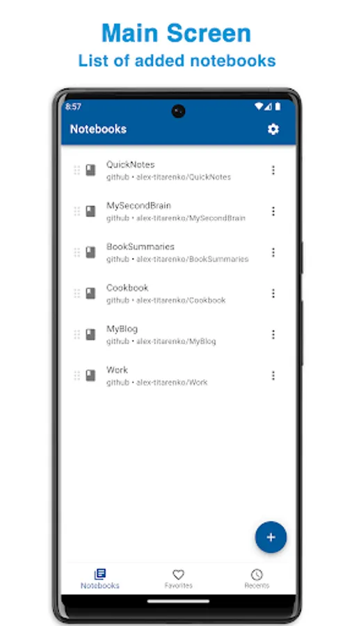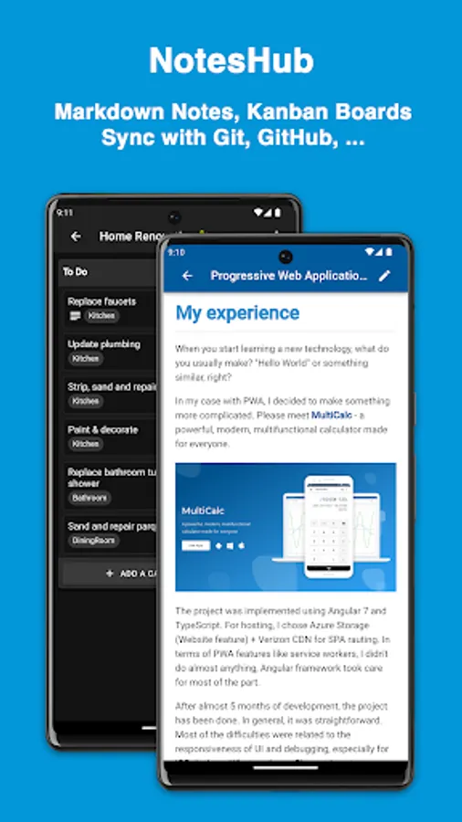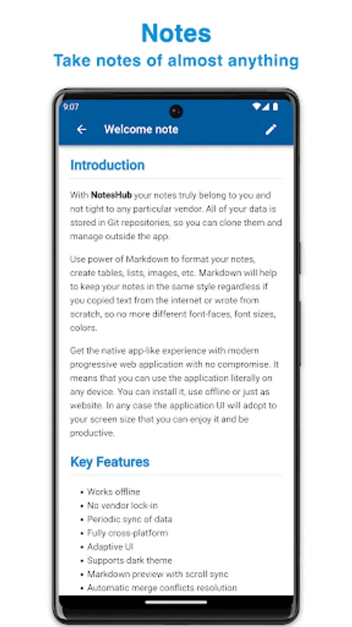 With NotesHub your notes truly belong to you and are not tight to any particular vendor. All of your data is stored in Git repositories, so you can clone and manage it outside the app.