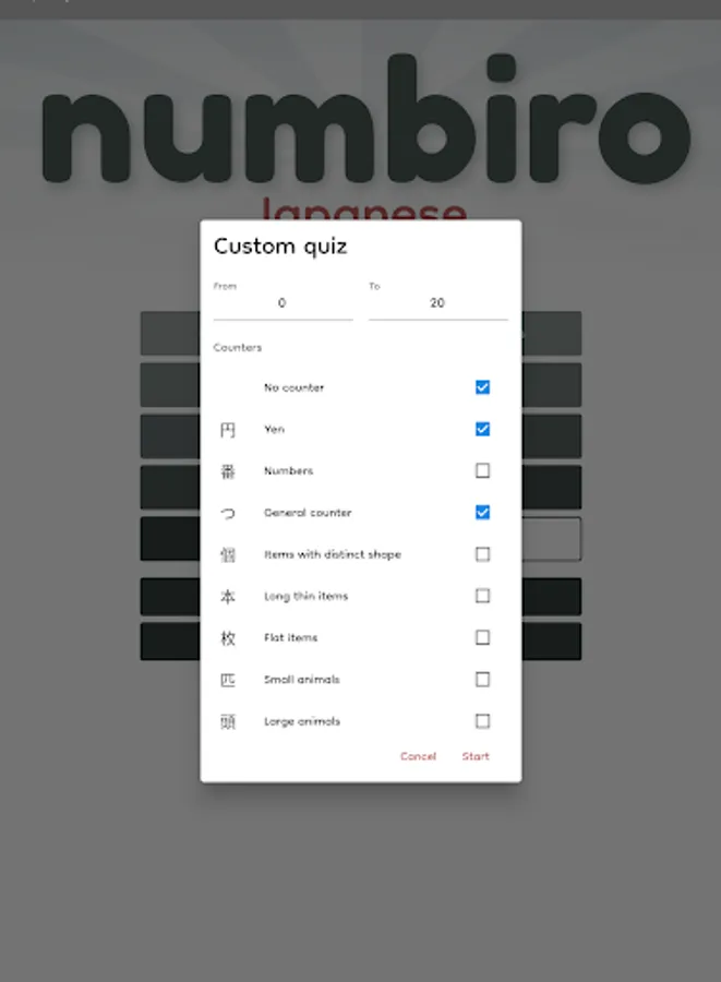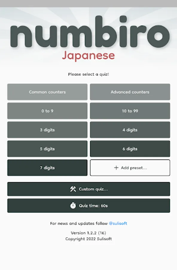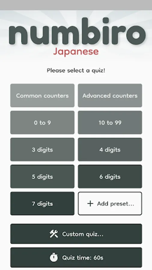 Learning the Japanese numbers is one thing, but recognising spoken numbers during everyday conversation is another! With Numbiro you can perfect your abilities by listening to numbers spoken in Japanese and identifying them. You can select the range of numbers you are learning, from single-digit numbers to millions or even billions. You can even practice Japanese counters, with 66 to choose from. See how many you can get correct in a minute!