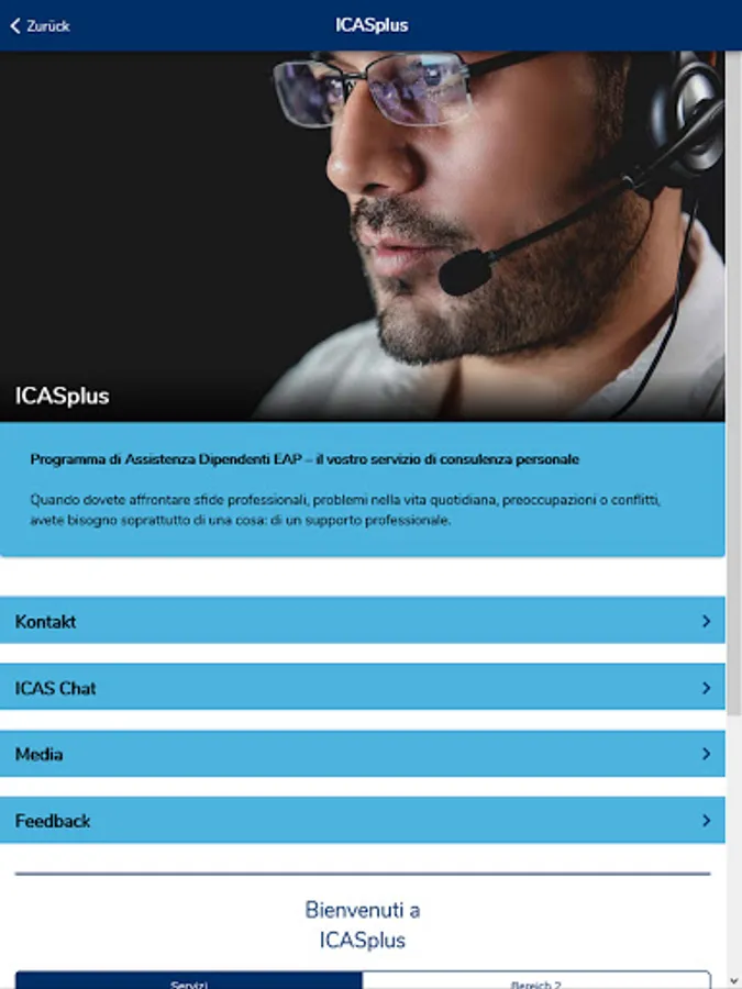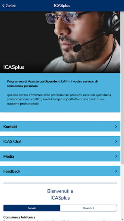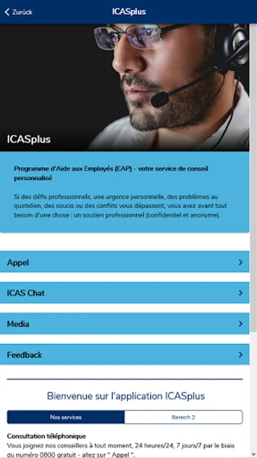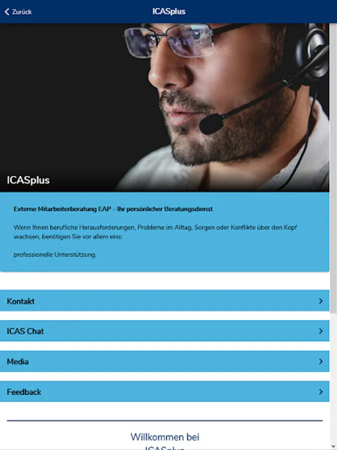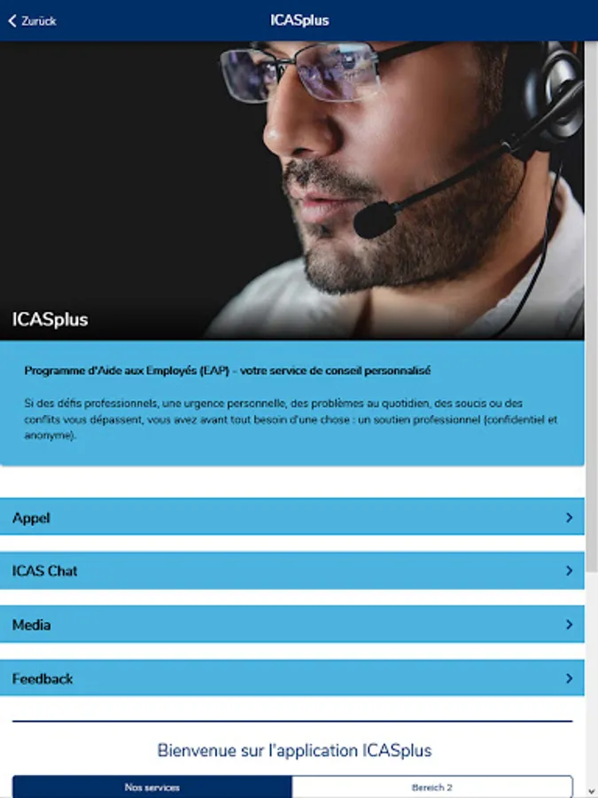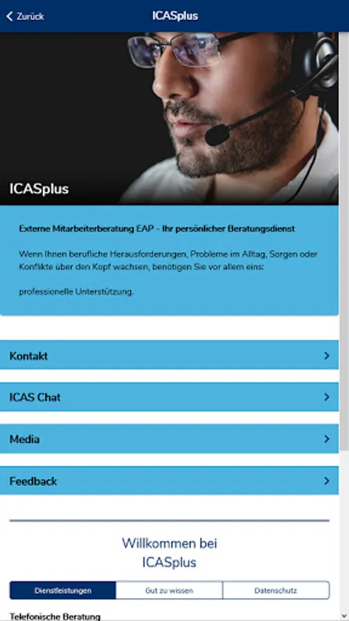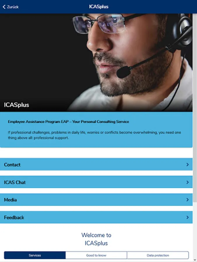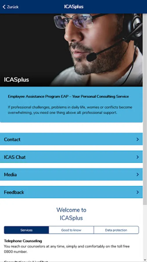 The ICASplus app offers employees of our client companies quick access to the ICAS Employee Assistance Program EAP. Via telephone and live chat, employees of our client companies seeking advice can contact our counsellors 24/7 if professional challenges, problems in daily life, worries and conflicts become overwhelming. The app provides an overview of our services and allows direct contact by telephone and live chat. An explanatory video explains the service in a simple and easy-to-understand way. The media library contains information not only about the EAP, but also on a variety of topics relevant to everyday professional and private life.