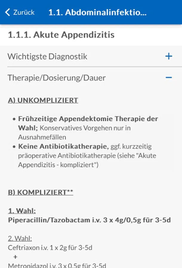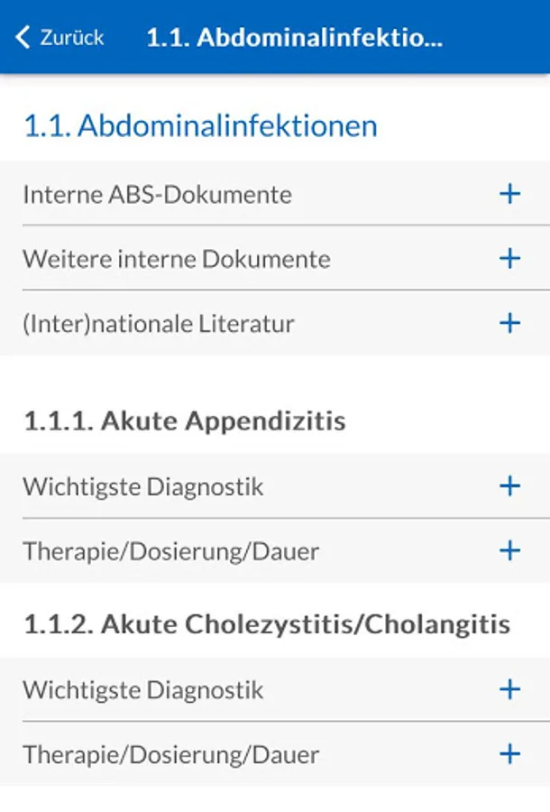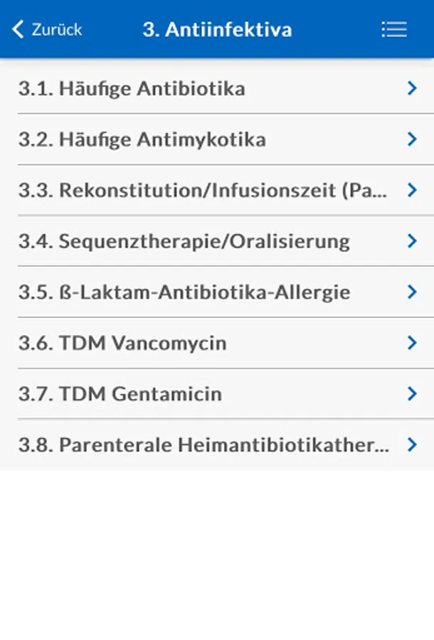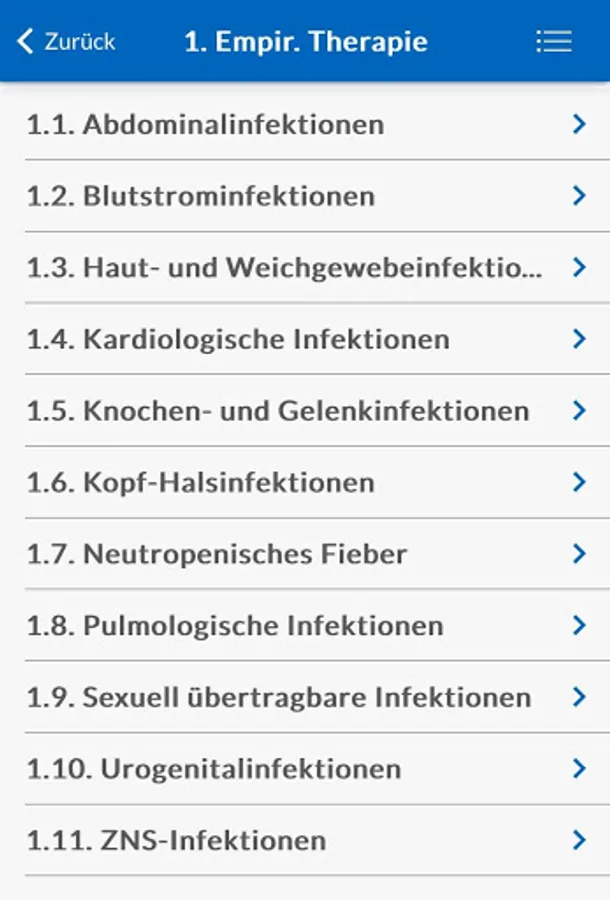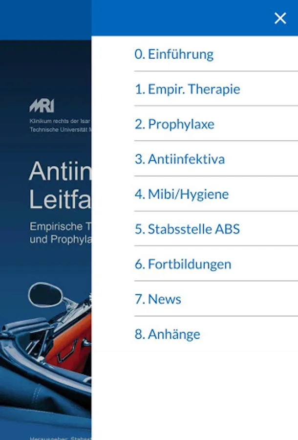 The purpose of this guide is a rational use of anti-infectives. A rational anti-infective therapy has become a complex challenge in view of the constant progress in medicine and the worsening resistance problem. This guideline provides standard recommendations for the prophylaxis and empirical therapy of frequent infections, taking into account current scientific knowledge, but also taking into account the local epidemiology of resistance and pharmaco-economic considerations. Once the microbiological findings have been received, the therapy should be adjusted in line with the clinical course. The guide is not a textbook and is not a substitute for careful clinical assessment of the patient and the adaptation of therapy to individual circumstances in justified cases. The app serves purely for imparting knowledge and does not fulfill any additional medical purpose, such as diagnosis, contraception, monitoring, prognosis, treatment of diseases, etc. in the sense of an active decision-making aid or dosage aid.