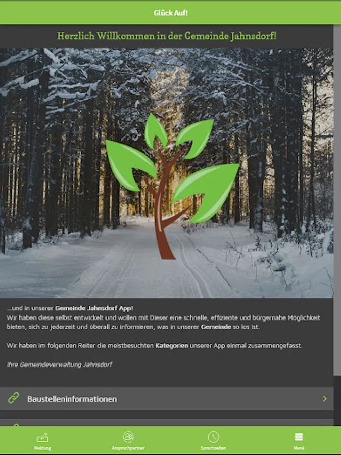 Innovation. proximity to citizens. Communication. All this is important to us as a municipal administration. We are therefore pleased to present the official Jahnsdorf app to you. We would like to give you the opportunity to contact the town hall quickly and directly. For example, you can use the "Report" function to report damage or the like as easily as never before. In addition, many other applications are waiting to be discovered by you. This app is meant to be everything but not static. We will continuously install new tools to make our community with its 4 districts even more attractive. Have fun with the App!
