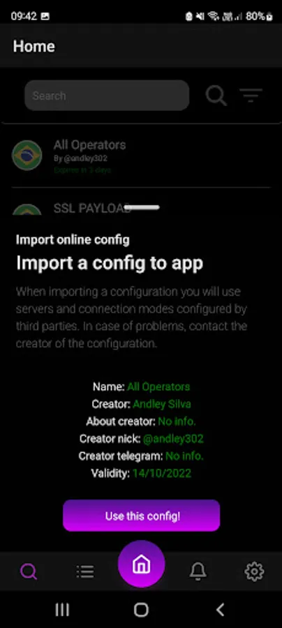 NC VPN is a free platform for vpn file creation and cloud upload. While file creators make their settings, the user will be able to find them within the app itself, through the search bar, with several available filters (Name, creator, country, etc).