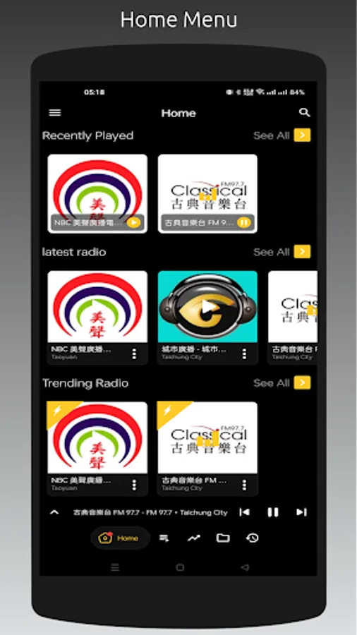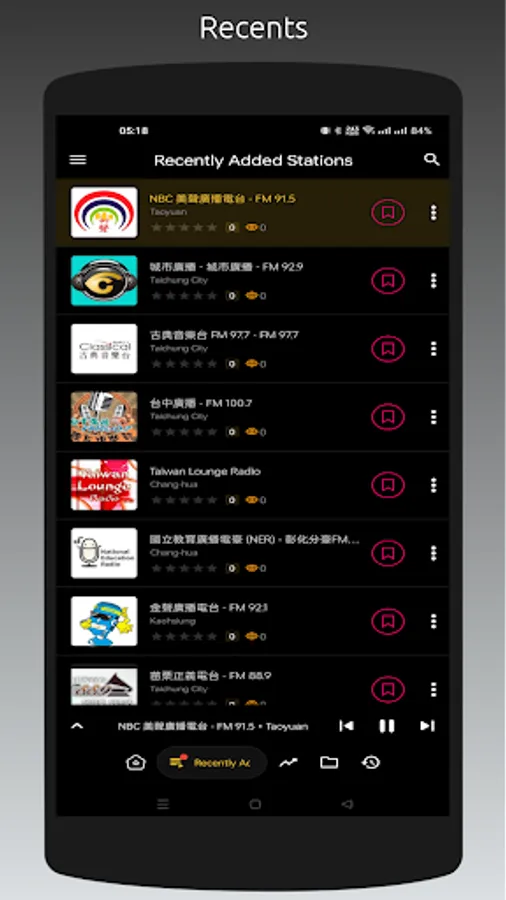 - Recently played stations list