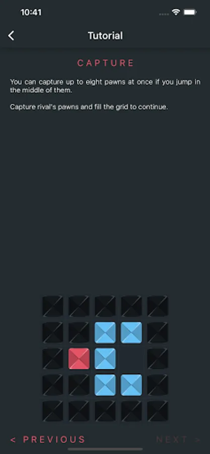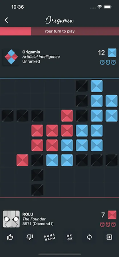 Join a game, face other players or Origamia itself (Ai). Touch one of your pawn to duplicate (1 square around) or jump (2 squares around). You win the game when the grid is completely filled or when your rival is stuck. Easy, isn't it?