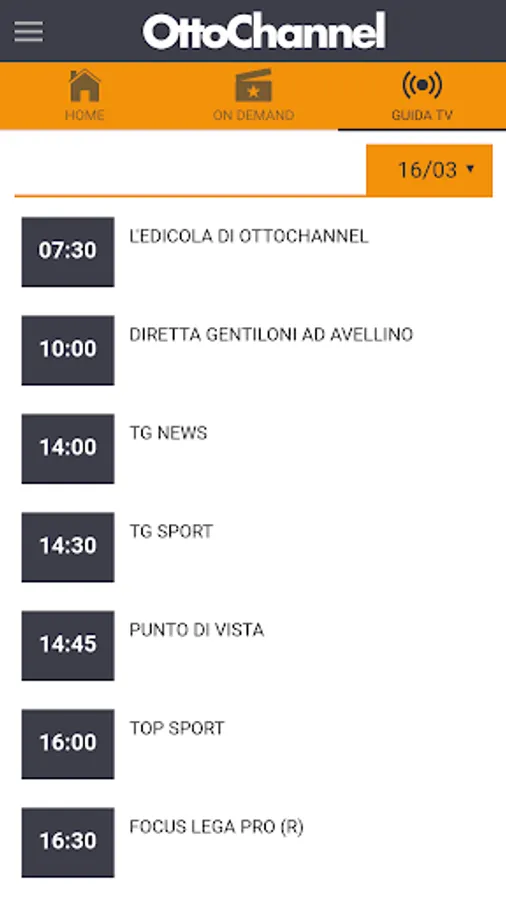 -Programmes sports including 5 dedicated to football on all regional fields (from series A to series B and Lega Pro and less calcium) 1 to basketball in the top flight (OttoChannel's official broadcaster of Scandone Basketball), and 1 other sport;