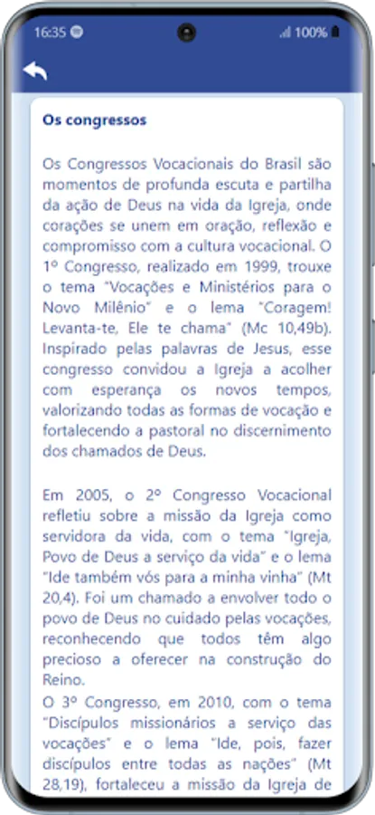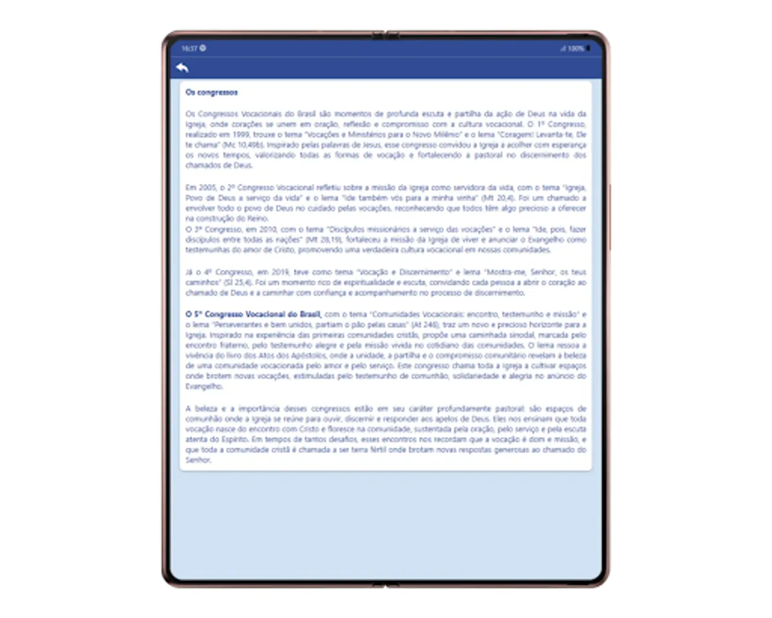 With the official app of the Brazilian Vocational Congress, you'll have access to all the information and resources you need to intensely experience this moment of faith, communion, and discernment.
