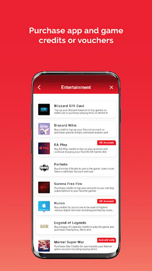 Entertainment: Purchase gift cards and credits for online subscriptions easily in a few clicks.