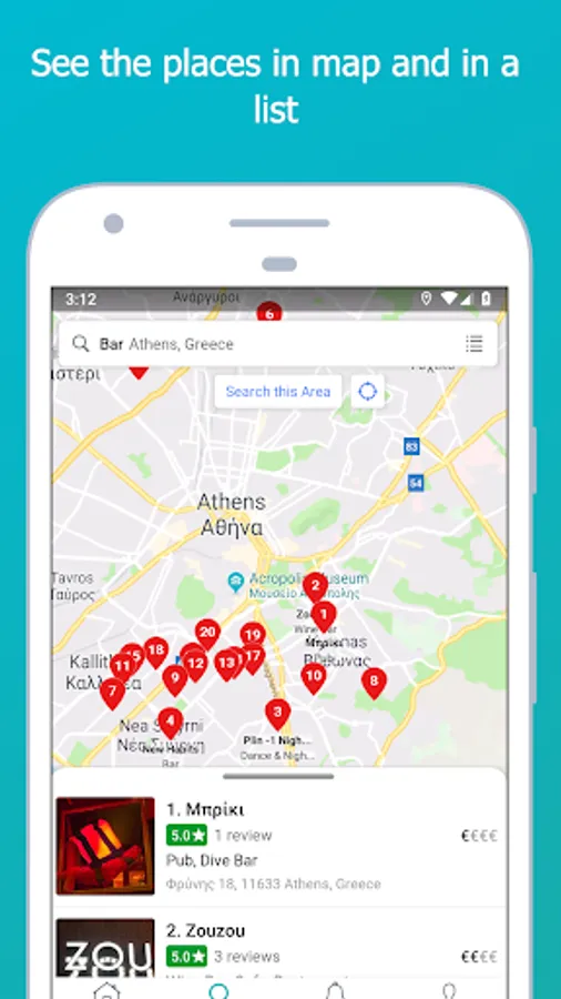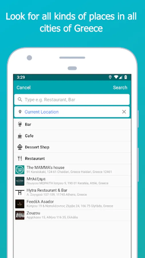 - Discover cafe, bars, restaurants all over Greece. You can search for places of a specific type or cuisine (e.g. cocktail bar or mexican restaurant) in a selected city or area.