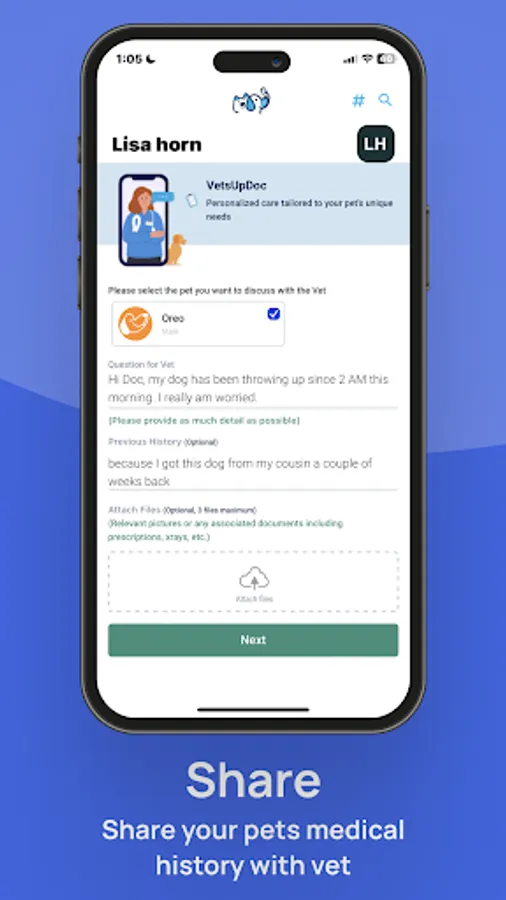 4. Select the pet you want to discuss and provide details with pictures, if any