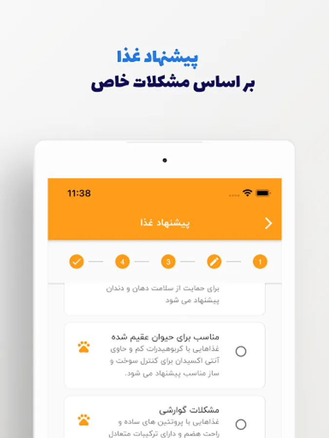 انتخاب غذا بر اساس مشکلات خاص پت مثل مشکلات گوارشی، چاقی، مناسب برای حیوانات عقیم شده یکی از امکانات فرم پیشنهاد غذای پت آباد هست که به کمک اطلاعات درمانی پت شما، بهترین گزینه های موجود برای پتت رو بهت معرفی میکنه.