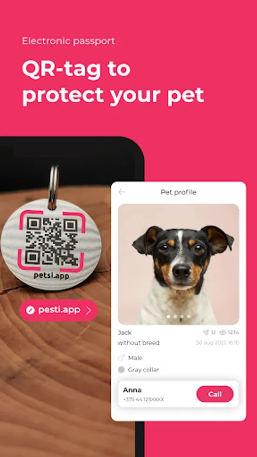 Keep your pet safe and register with Petsi. Your dog or cat will have their own modern online profile and a unique pet ID - QR code, which is used as an ID tag. Once somebody scans the code they will be redirected to a pet's profile with the owner's contact details. And the owner of a missing pet will receive notification with the GPS location of the scanning place!