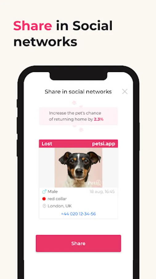 4. If someone takes a photo of your pet, Petsi will make your pet identification using a unique facial recognition technology, and immediately prompt your contact information for communication.