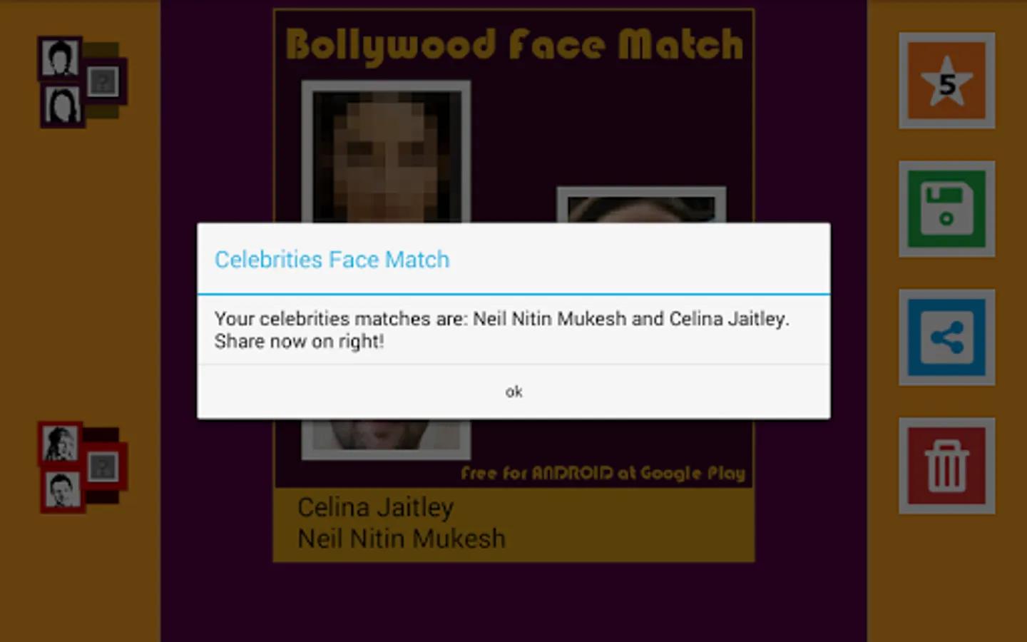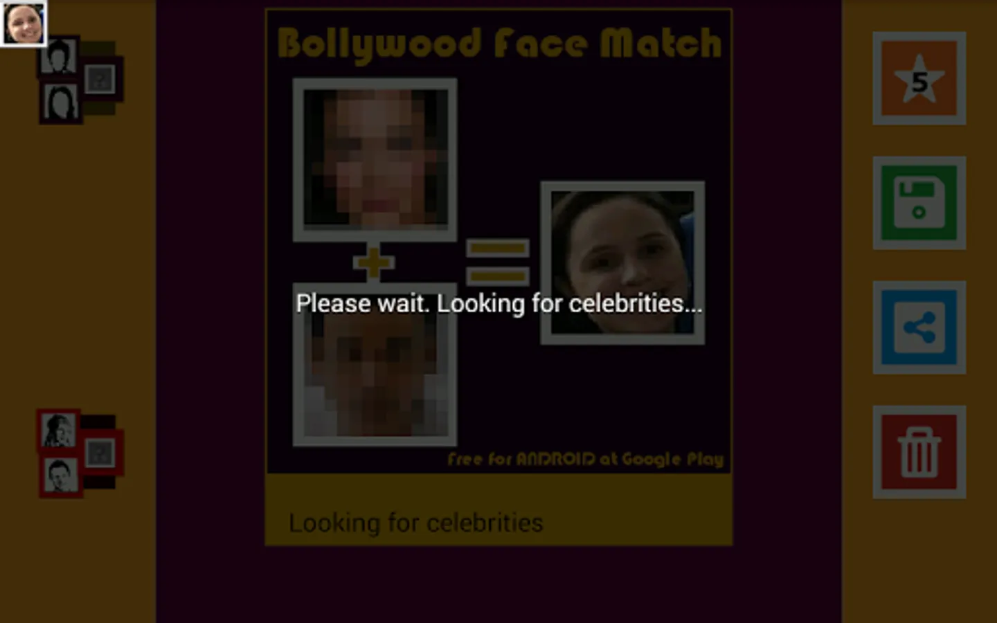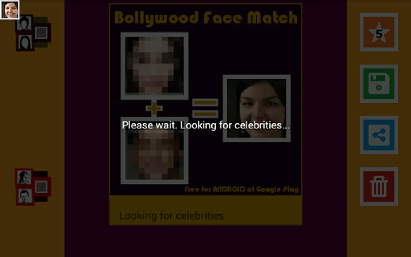Super fast download and easy to use: within the app, select any photo from your smartphone or tablet, and just wait for the app to find out the Bollywood celebrities that most look like you! Then share the results on social networks or by message, or save them in your phone's or tablet's memory!
