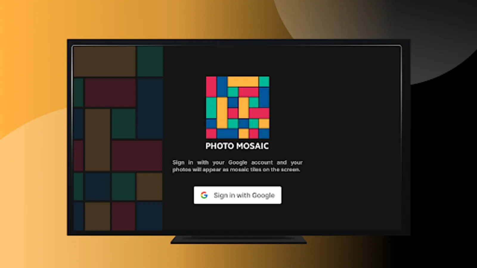 Photo Mosaic is an app that is connected to your Google account and by logging in by Gmail you can see your account's photos on the Tv`s screen. You can adjust the number of photos and seconds of rotation. Just download, log in see your favorite photos in the most beautiful view.