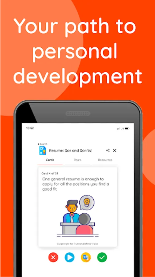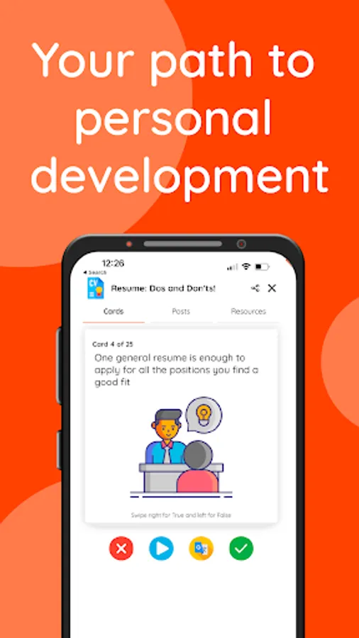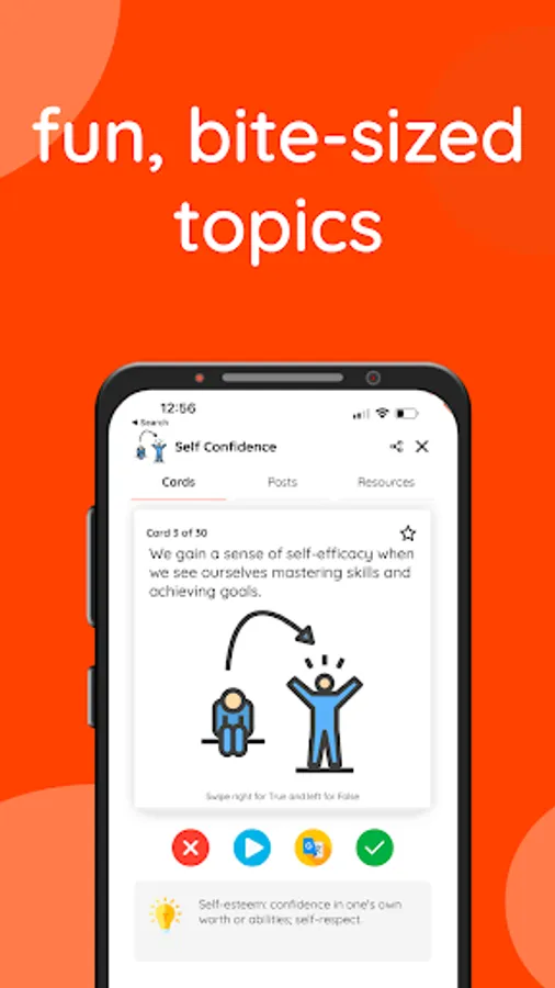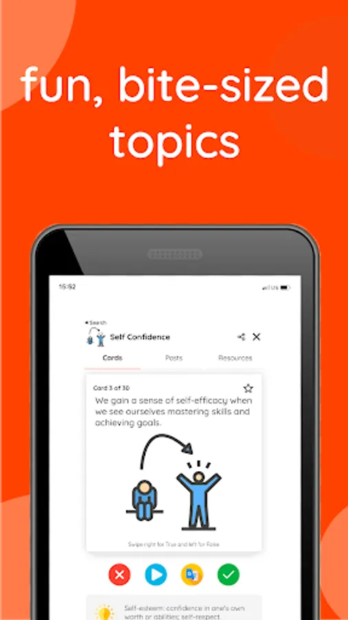It is simple! You can select a topic of interest, then you are presented with a series of cards, in a trivia-style game. Each card contains a sentence that is either true or false. After reading the sentence, you swipe right, if you think the phrase on the card is true, and swipe left if you think it is a false claim. Upon each swipe, you get instant feedback with a short answer. Then you can dig deeper into the topic by reading a series of short posts in a FAQ style, or read articles or booked linked to the topic to learn more.