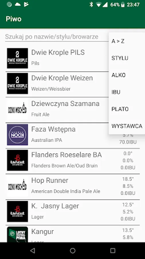 2. List of beers Here you can browse all (added by the exhibitors) beers, sort them by selected criteria (eg IBU, BLG, style, or alc.). Additionally, you can also rate each beer (one beer only once!).