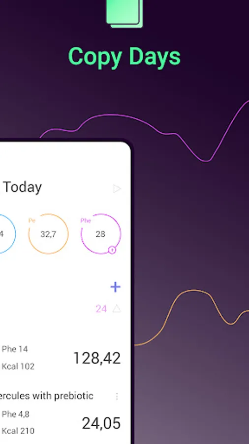 ○ calculation of product indicators when added to the diet: you can now enter grams • phenylalanine • protein. All fields are recalculated automatically;