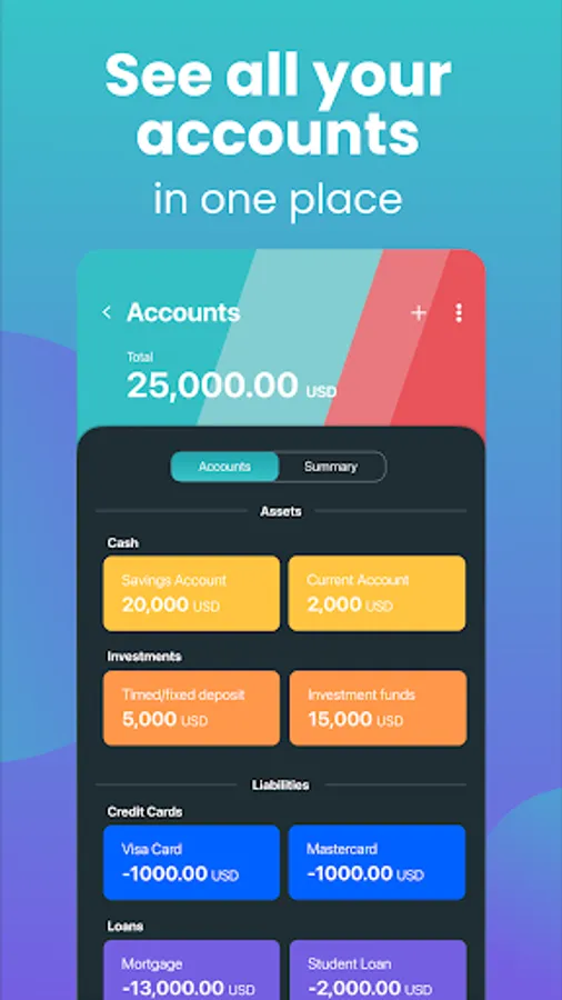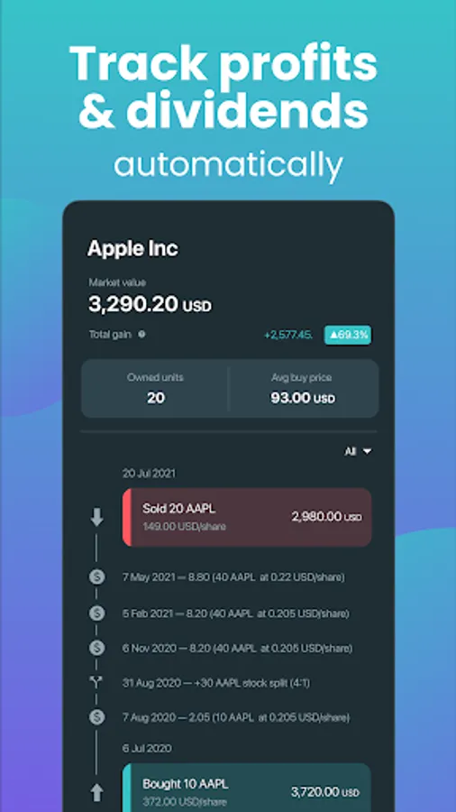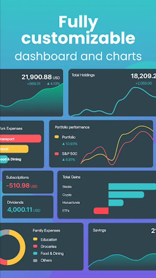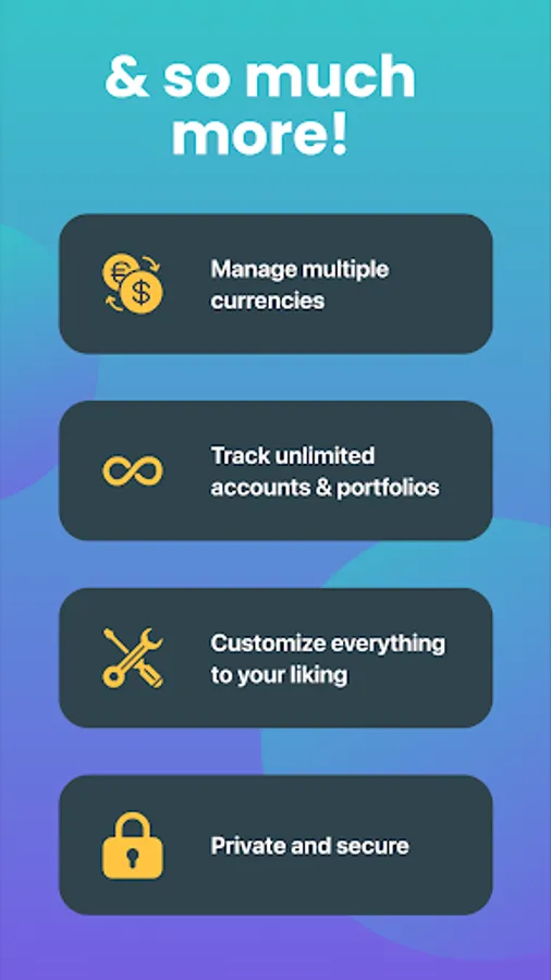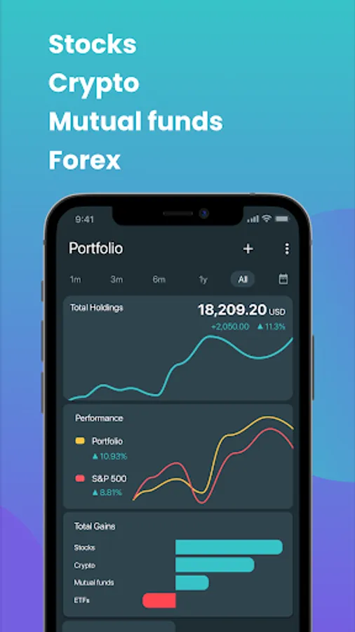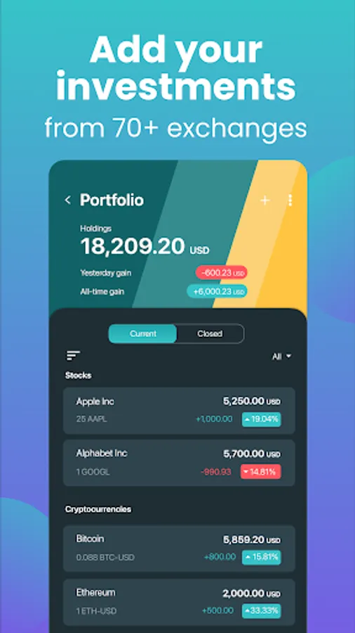 - Add investment assets from over 70 exchanges worldwide (stocks, crypto, ETFs, forex, mutual funds)