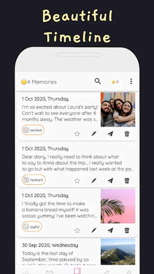 πΌοΈ Photo Journal β Keep your photo memories by adding photos to your diary. You can add travel photos, fitness progress photos, food photos, personal photos with your friends and family.