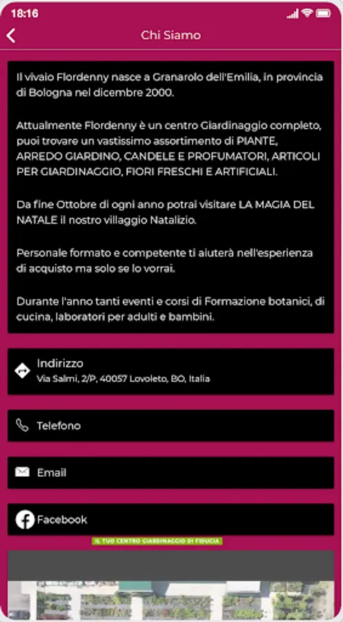 The Flordenny nursery was born in Granarolo dell'Emilia, in the province of Bologna in December 2000, currently Flordenny is a complete gardening center, you can find a vast assortment of PLANTS, GARDEN FURNITURE, CANDLES AND PERFUMERS, GARDENING ITEMS, FRESH AND ARTIFICIAL FLOWERS from at the end of October each year you can visit THE MAGIC OF CHRISTMAS our Christmas village.