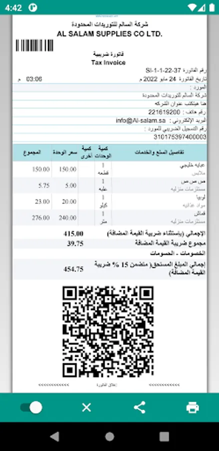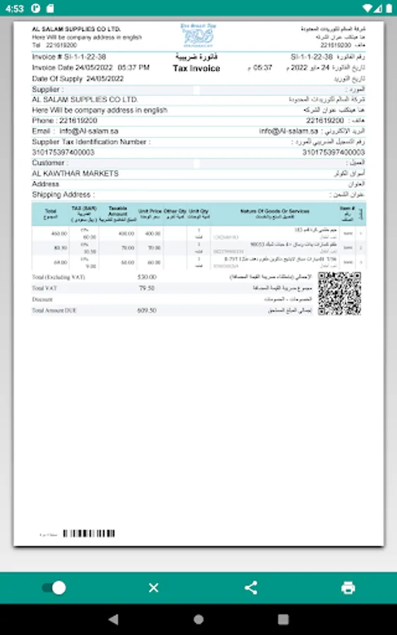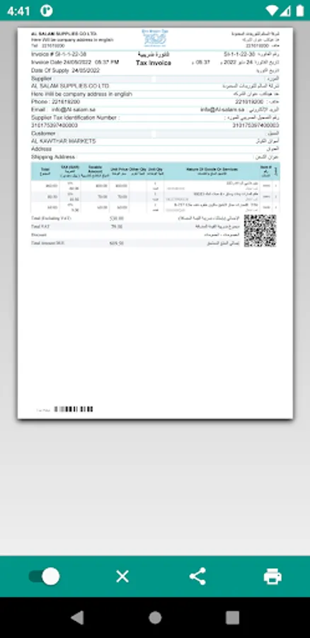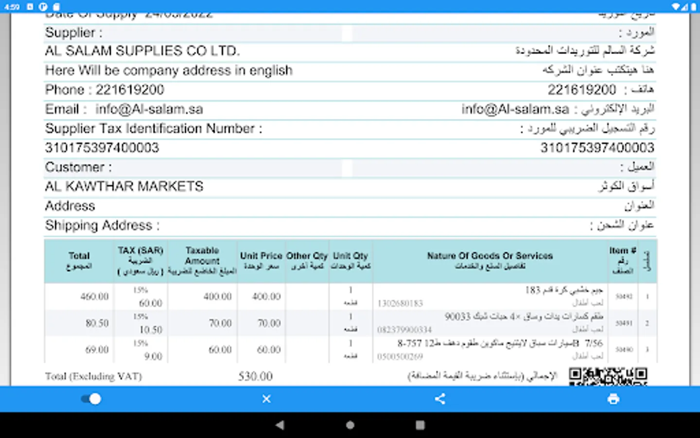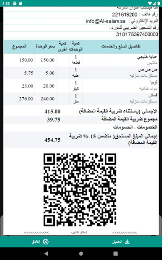 Generate a QR code for each electronic invoice / credit note / debit note according to the first stage of the Zakat, Tax and Customs Authority's requirements ( ZATCA - KSA ).
