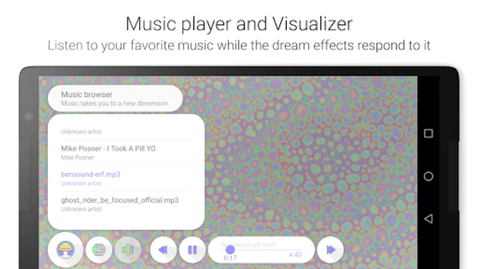 Inbuilt music player and visualizer enable you to play your favorite music and make the music change the dream. It works realtime by detecting bass, mid and treble notes in the currently playing song. The effects of the dream are directly influenced by these notes and its fully customizable.