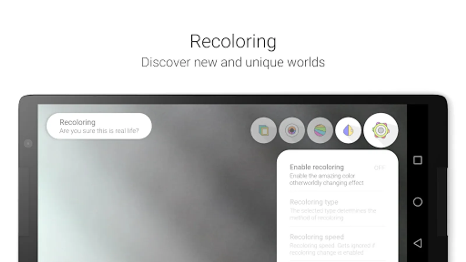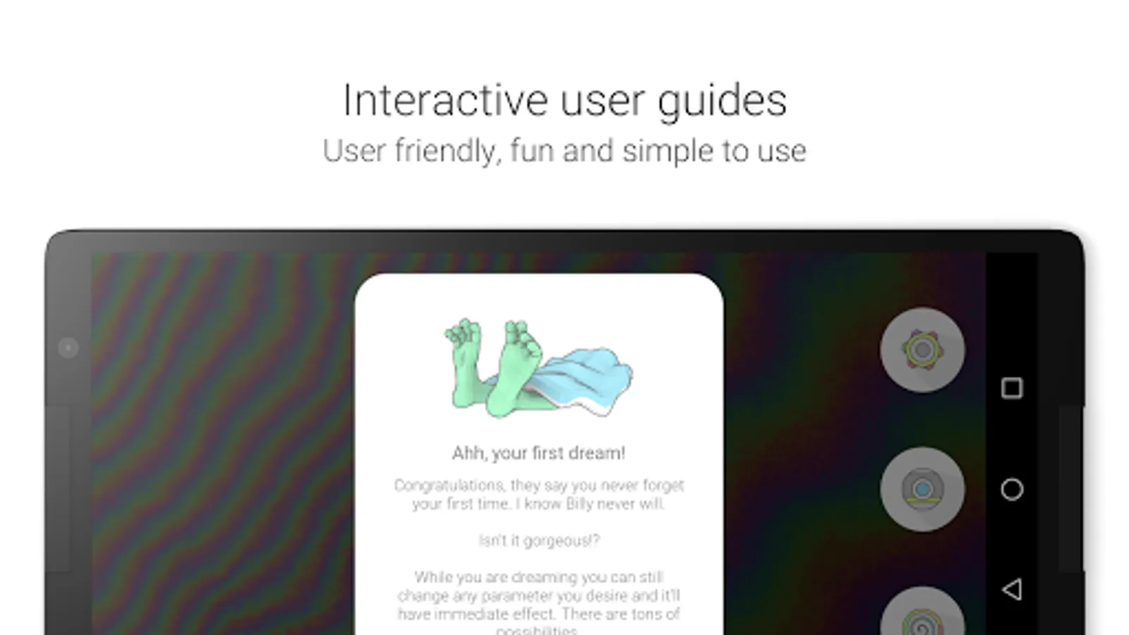 Dream mode is fully customizable through the customize menu. Three major effect groups can be customized from effect speed, size, gradual change, effect type, effect blending and more. Adapt your trip to your preferences, enable or disable certain effects, make some stronger, some weaker or just experiment to see what all is possible. All real-time within the app.