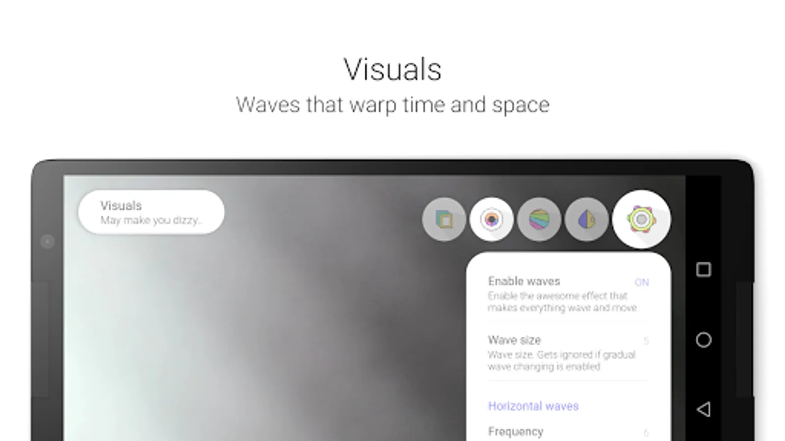 - Visualizer, effects change, become weaker/stronger/faster/slower based on the in-app music that is playing