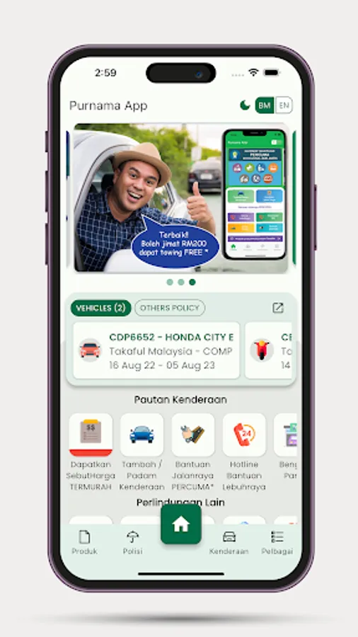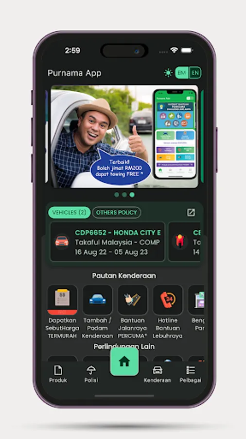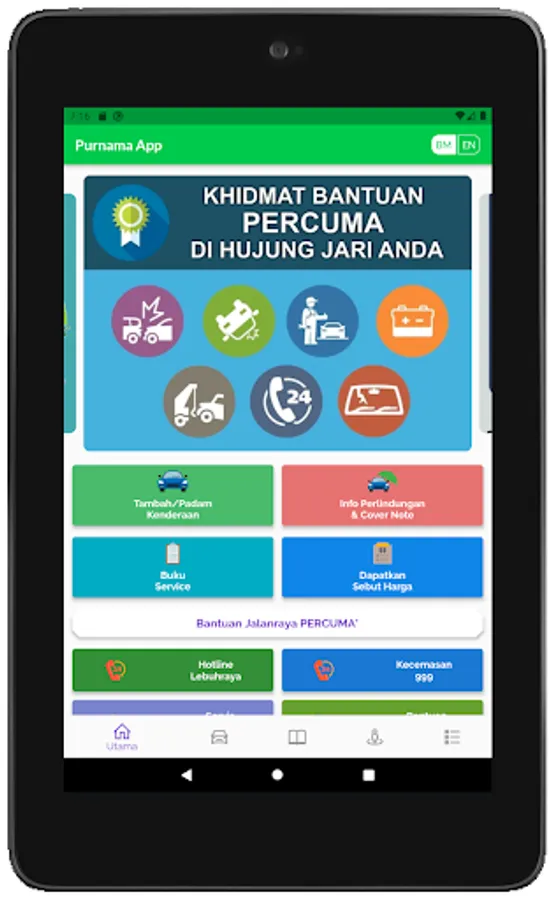 Kini semuanya DIHUJUNG JARI!!! Aplikasi PURNAMA merupakan satu-satunya aplikasi yang anda perlukan untuk perlindungan kenderaan anda. Ia memudahkan anda untuk mengakses khidmat tunda kenderaan dan bantuan kerosakan secara PERCUMA yang ditawarkan oleh syarikat insurans atau takaful.
