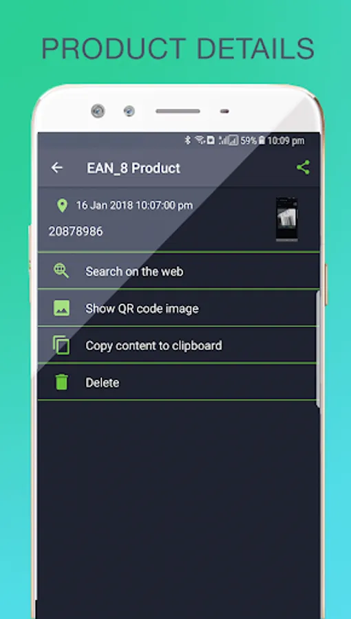 2) The QR-code reader activates the recognition function, takes a picture and saves it in the code history.