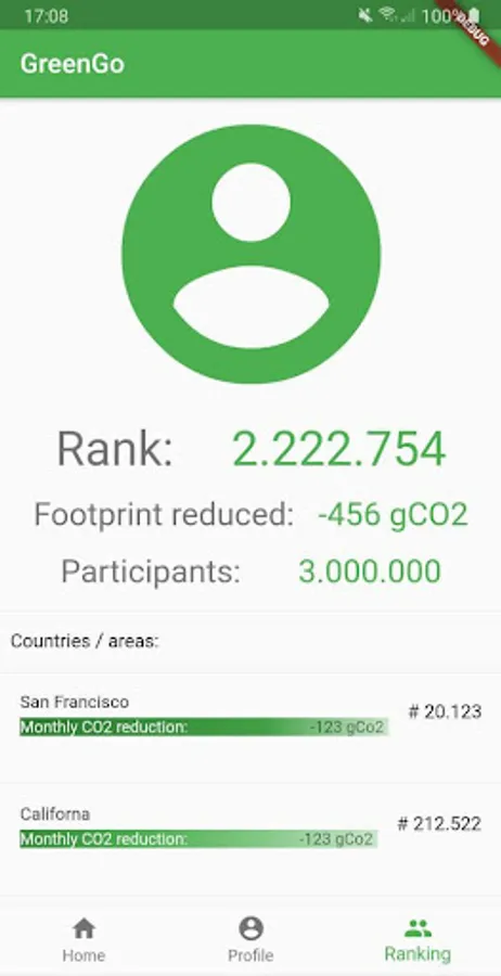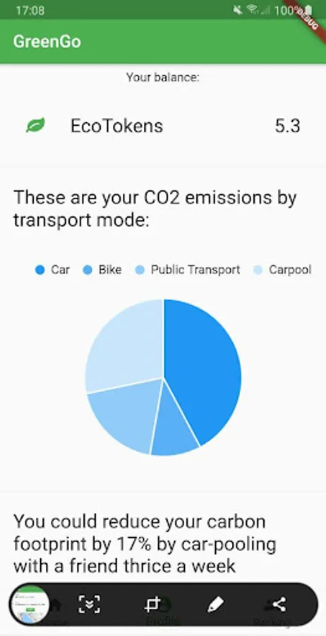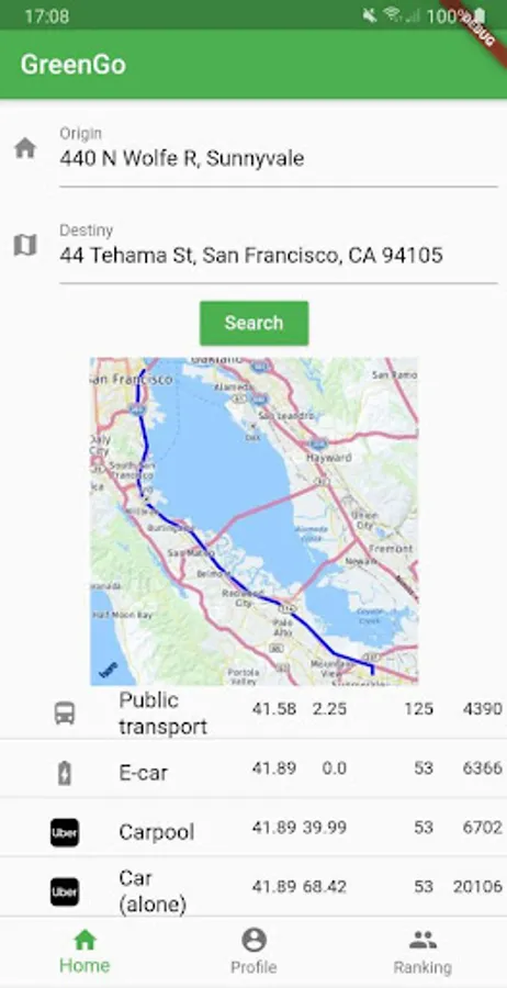 With GreenGo, you can see your carbon footprint for different ways of going from point A to point B, such as car sharing, biking and so on. You can also simulate the impact of a ride and call an Uber directly from the app.