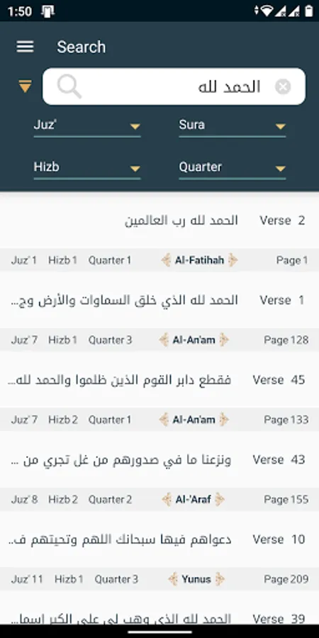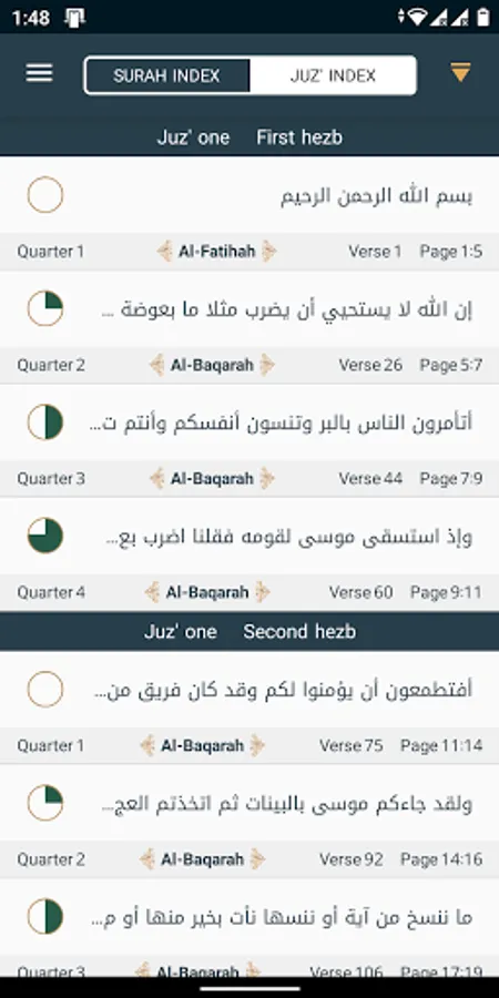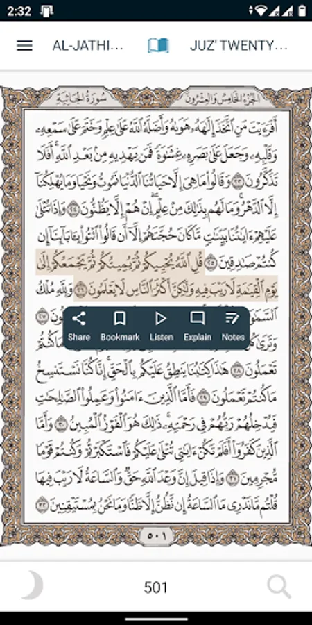 • Ability to highlight verses (ayas) to show more options like playing their audio or showing their tafsir.