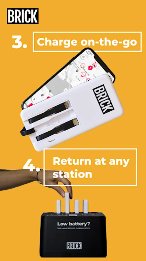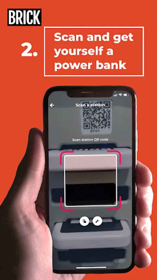 We have created a network of charging stations for portable power banks that you rent "on-the-go". Open the Brick app and find the nearest Brick station on the map. Then scan the station's QR code and rent a power bank that you can charge your mobile, tablet or headphones with. When you have finished charging, you can return the power bank to any Brick station. Works with all mobile phones.