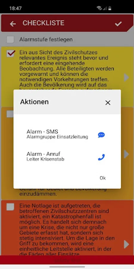 With the help of the interactive checklists, you always have an eye on the steps to be taken in an emergency. Alarm levels can be defined quickly and safely using this checklist. Thanks to the alerting and notification function, you are immediately forwarded to important documents and can alert people involved with a few clicks by phone calls and SMS.