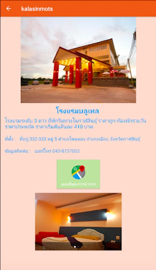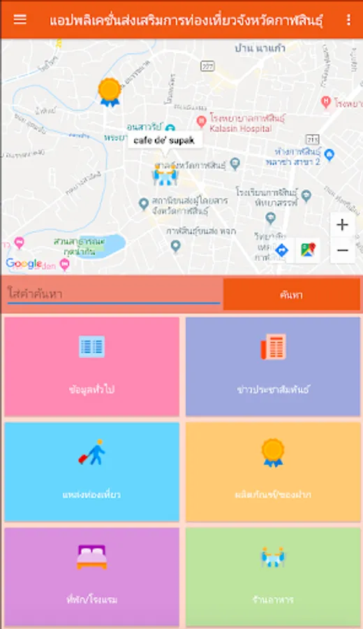 Applications promoting tourism, Kalasin Created to facilitate the tourism of Kalasin province. Which consists of content Tourist attractions, accommodations, souvenirs, hotels, restaurants, products, which can be used via maps and navigation with Google Map.