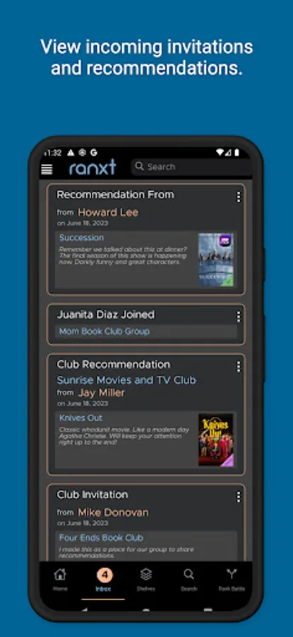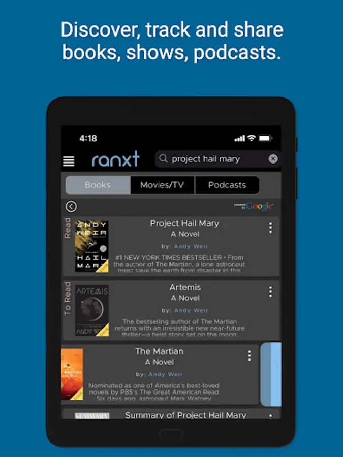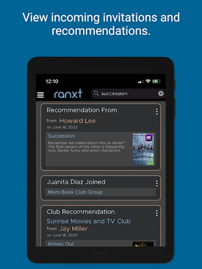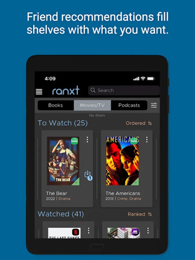 Did you read, watch or listen to something your friends would love? With ranxt, it's as easy as a search and a click to recommend the title to your friend.